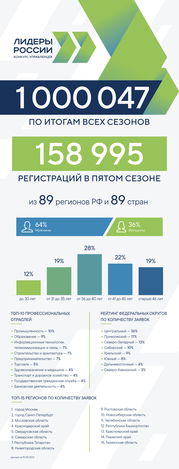На участие в пятом юбилейном сезоне конкурса управленцев «Лидеры России» – флагманского проекта президентской платформы «Россия – страна возможностей» – поступило около 160 тысяч (158 995) заявок от представителей всех российских регионов и 89 стран мира. Прием заявок стартовал 4 апреля и завершился 14 мая 2023 года. Участники загрузили в систему биографическую анкету и видеоинтервью. Это обязательное условие для доступа к последующим заданиям дистанционного этапа.
