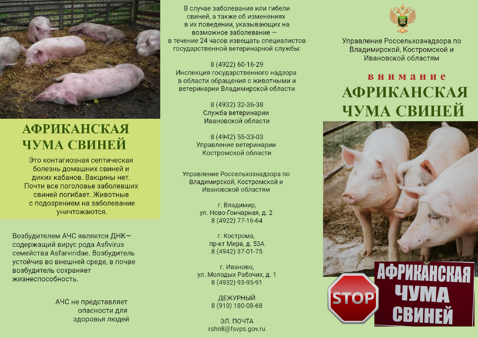 Обо всех случаях падежа свиней, а также при обнаружении трупов свиней на территории Владимирской, Костромской и Ивановской областей, необходимо немедленно сообщить в субъектовые ветеринарные учреждения по телефонам: 8(4922)60-16-29 (г. Владимир); 8(4942)55-32-03 (г. Кострома); 8(4932)32-36-38 (г. Иваново) или в Управление Россельхознадзора по Владимирской, Костромской и Ивановской областям в рабочие дни с 8.30 до 17.00 по телефонам: