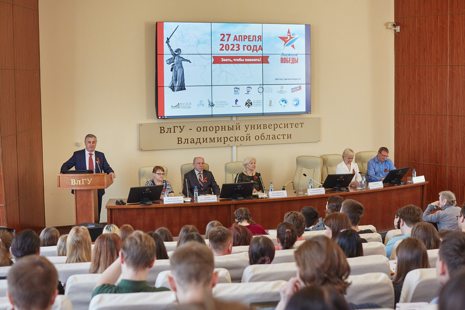«В пятый раз ВлГУ стал центральной площадкой акции "Диктант Победы" во Владимирской области. Мы проводим ее при поддержке регионального отделения Российского исторического общества. Помню, как три года назад в стенах ВлГУ в ней участвовал ветеран Николай Матвеевич Щелконогов. Он был добрым другом нашего университета, активным участником просветительских и патриотических мероприятий. Для каждого человека участие в диктанте – это уникальный шанс почувствовать свою сопричастность к героической истории России, еще раз вспомнить великий подвиг наших предков. Важно, чтобы мы берегли память о тех событиях и героях! Вовлечение молодежи в изучение исторических фактов и архивных источников, передача ей достоверной исторической памяти, патриотическое воспитание – важные задачи в современном мире. Их решением занимаются студенты и преподаватели ВлГУ», – подчеркнул и.о. ректора ВлГУ Анзор Саралидзе .По традиции участникам акции за 45 минут предстояло ответить на 25 вопросов: 20 - по общей военно-исторической тематике и 5 – по региональной. В Диктант вошли вопросы о Нюрнбергском процессе, победе Красной армии в Сталинградской и Курской битвах, освобождении Донбасса от нацистов, прорыве блокады Ленинграда.