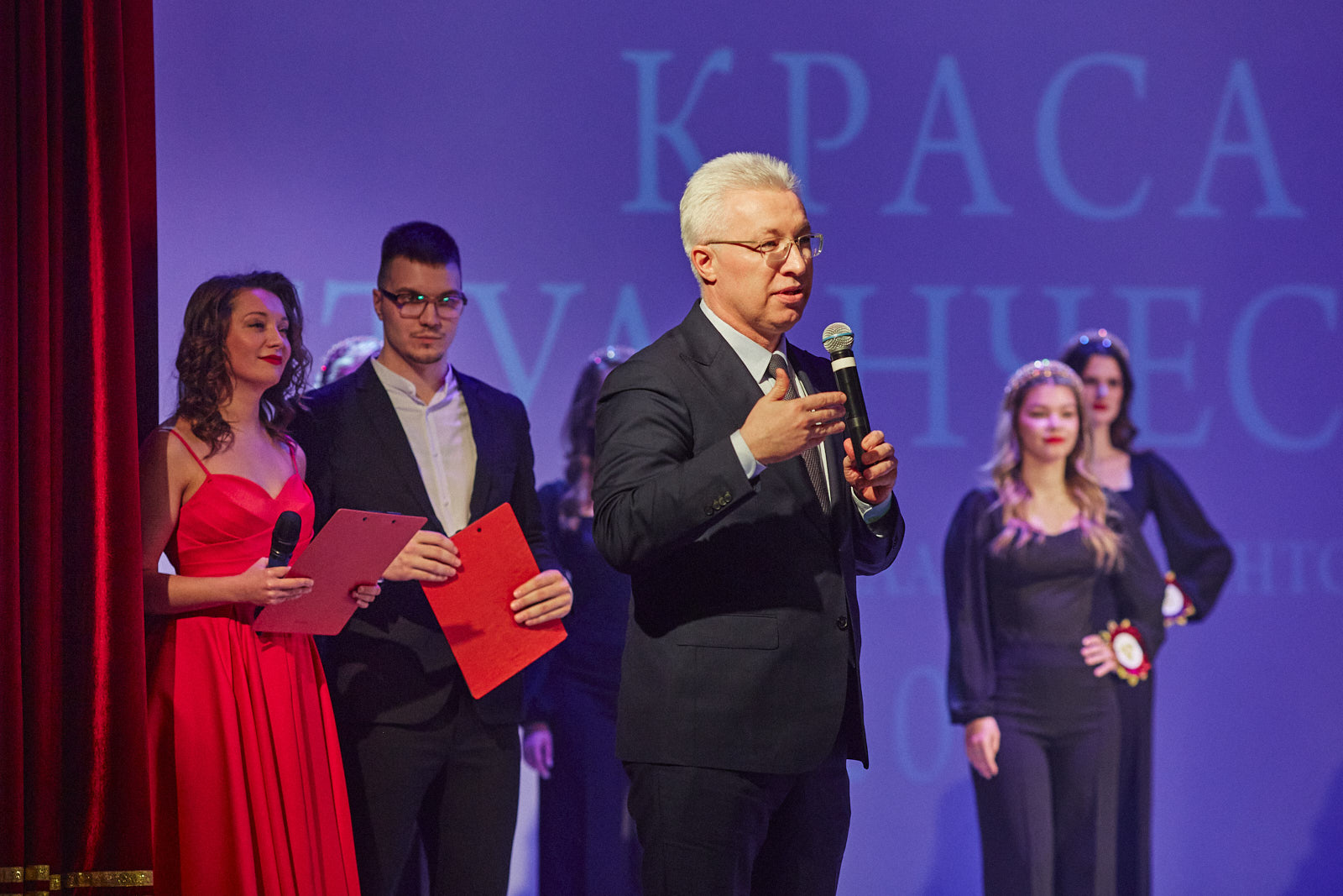 «Участвовать в нашем конкурсе престижно и значимо. Со своей стороны, нам важно активно участвовать в сохранении и продвижении традиционных духовно-нравственных ценностей, популяризации русских традиций и национального костюма. Сегодня уровень красоты в этом замечательном зале просто зашкаливает. "Краса студенчества Владимирского филиала Президентской академии" – знаменует старт предстоящей весны. А самим конкурсом мы лишний раз говорим, что красота спасет мир», – отметил директор Владимирского филиала Президентской академии, заместитель председателя Законодательного Собрания Владимирской области Вячеслав Картухин .Ведущими конкурса стали актриса Владимирского академического театра драмы Анна Лузгина и сотрудник отдела внеучебной работы и трудоустройства филиала Глеб Глебов.