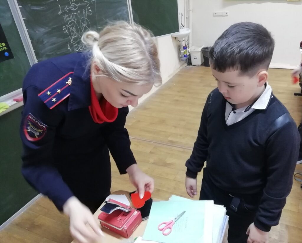 В начале занятия инспектор по пропаганде Юлия Демчан напомнила ребятам правила безопасного перехода проезжей части и разъяснила принцип действия помощников пешеходов- световозвращающих элементов. Далее ребята вместе с инспектором и активистами из отряда ЮИД изготовили брелоки из световозвращающей бумаги в форме сердечек. По окончании занятия, каждый ребенок разместил у себя на рюкзаке “сердечко безопасности”, которое в темное время суток, при попадании на него света фар автомобиля, сделает детей яркими пешеходами и поможет водителям вовремя заметить ребят, снизить скорость и остановиться перед пешеходным переходом.