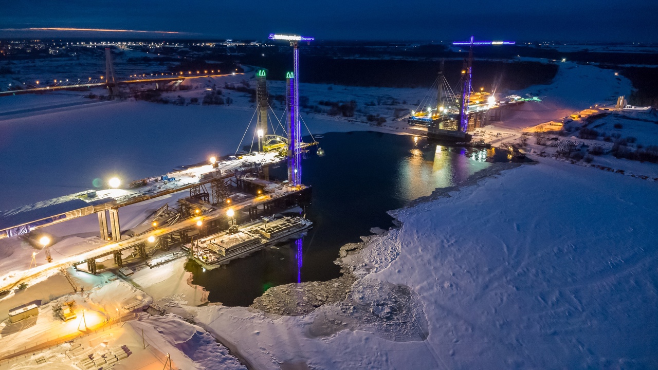А также проводят другие работы, которые можно проводить при низких температурах. На внеклассном вантовом мосту через Оку, который соединит Владимирский и Нижегородский берега на 4 этапе строительства М-12 работа не останавливалась и в Новый год. Сейчас, несмотря на 30-ти градусный мороз, мостовики ведут подготовку к монтажу ещё одной пары вант. Уже смонтировано 12 и 34 пар вант. Левый русловой полупролет (консоль) моста смонтирован на половину длины, правый — на четверть. Кроме этого, дорожники отсыпают площадки МФЗ, устраивают основание дорожной одежды, прокладывают кабельную канализацию, устанавливают сетчатое ограждение, укрепляют откосы, чтобы в сентябре этого года автомобилисты смогли по М-12 доехать от Москвы до Арзамаса. Всего на объекте задействовано 640 человек и 150 единиц техники. Общая протяженность вантового моста М-12 под Муромом составит — 1 км 300 метров.