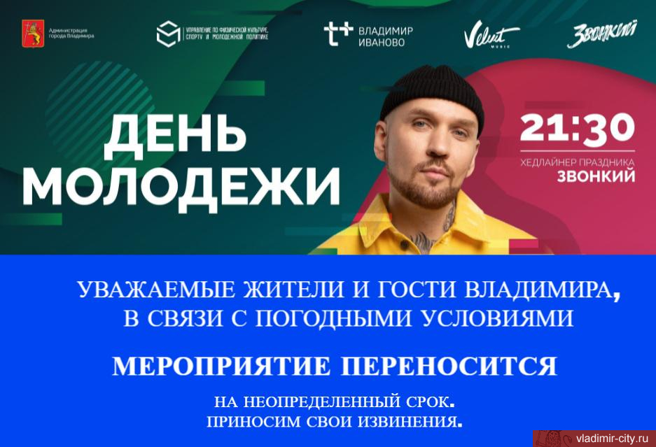Уважаемые жители и гости города Владимира! Мероприятия на центральной площади города, приуроченные празднованию Дня молодежи, ранее запланированные на сегодня, переносятся в связи с неблагоприятными погодными условиями.