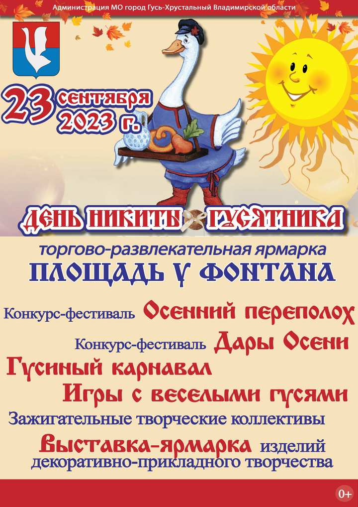 В этом году зрителей и участников торгово-развлекательной ярмарки ждет много интересного. Конкурсы-фестивали, игры с веселыми гусями, гусиный карнавал… Эти и другие события, окрашенные в осеннюю палитру, ждут нас на праздничное действо, которое состоится в субботний день, 23 сентября. Остается только надеяться, что погода не подведет и наступившее бабье лето еще порадует нас теплыми комфортными деньками.