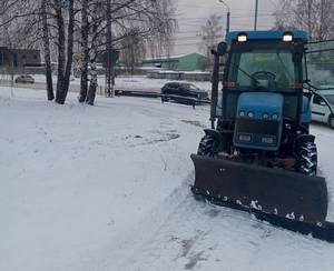 Тротуары убирают от снега на ул. Сосновой, ул. Колхозной, ул. Пионерской, ул. Киркижа, ул. Ранжева. Работает погрузчики ANT.