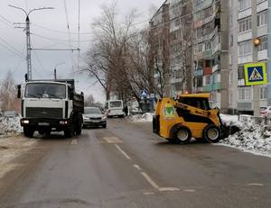 Осуществляется очистка от снега остановочных пунктов на ул. Строителей, ул. Еловой, ул. Комсомольской, пр. Ленина. Работают 2 погрузчика.