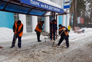 Две бригады рабочих из 8 человек чистят остановки на ул. Абельмана, ул. Октябрьской, ул. Фёдорова и около перенатального центра.