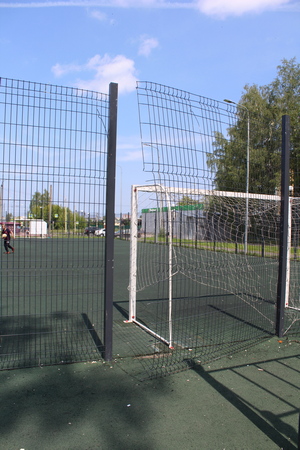 В сквере всегда много детворы и взрослых. Многие с удовольствием играют в мяч на спортивной площадке, где установлены небольшие ворота с сеткой. Для удобства игроков площадку огородили специальным сетчатым металлическим забором, чтобы мяч далеко не улетал. У площадки есть два входа с дверями. Спортивной площадке нет еще и года, но вандалы уже постарались. С ворот сорвали сетку и выломали часть забора.
