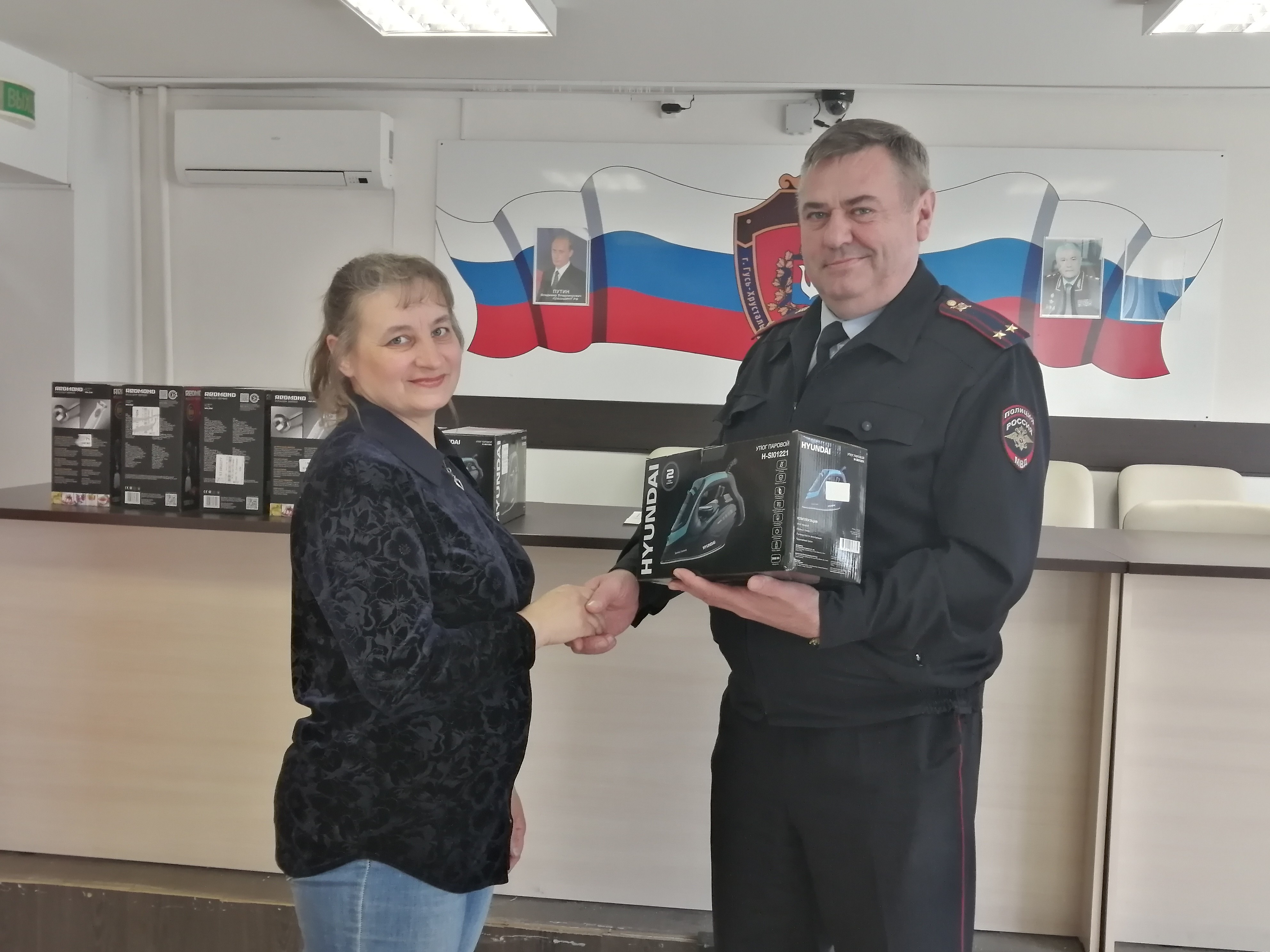 Продолжилось мероприятие вручением ценных подарков дружинникам за активную гражданскую позицию и значимый вклад добровольцев в дело охраны правопорядка на территории Гусь-Хрустального города и района.
