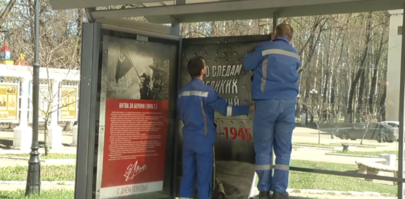 Рабочие разглаживают плакат на остановочном павильоне. Город оформляют к празднованию Дня Победы.