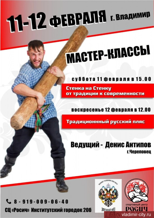11 и 12 февраля во Владимире в спортивном центре «Росич» (мкр. Юрьевец, ул. Институтский Городок, 20-б) пройдут мастер-классы по традиционной русской воинской культуре от этнографа Дениса Антипова.