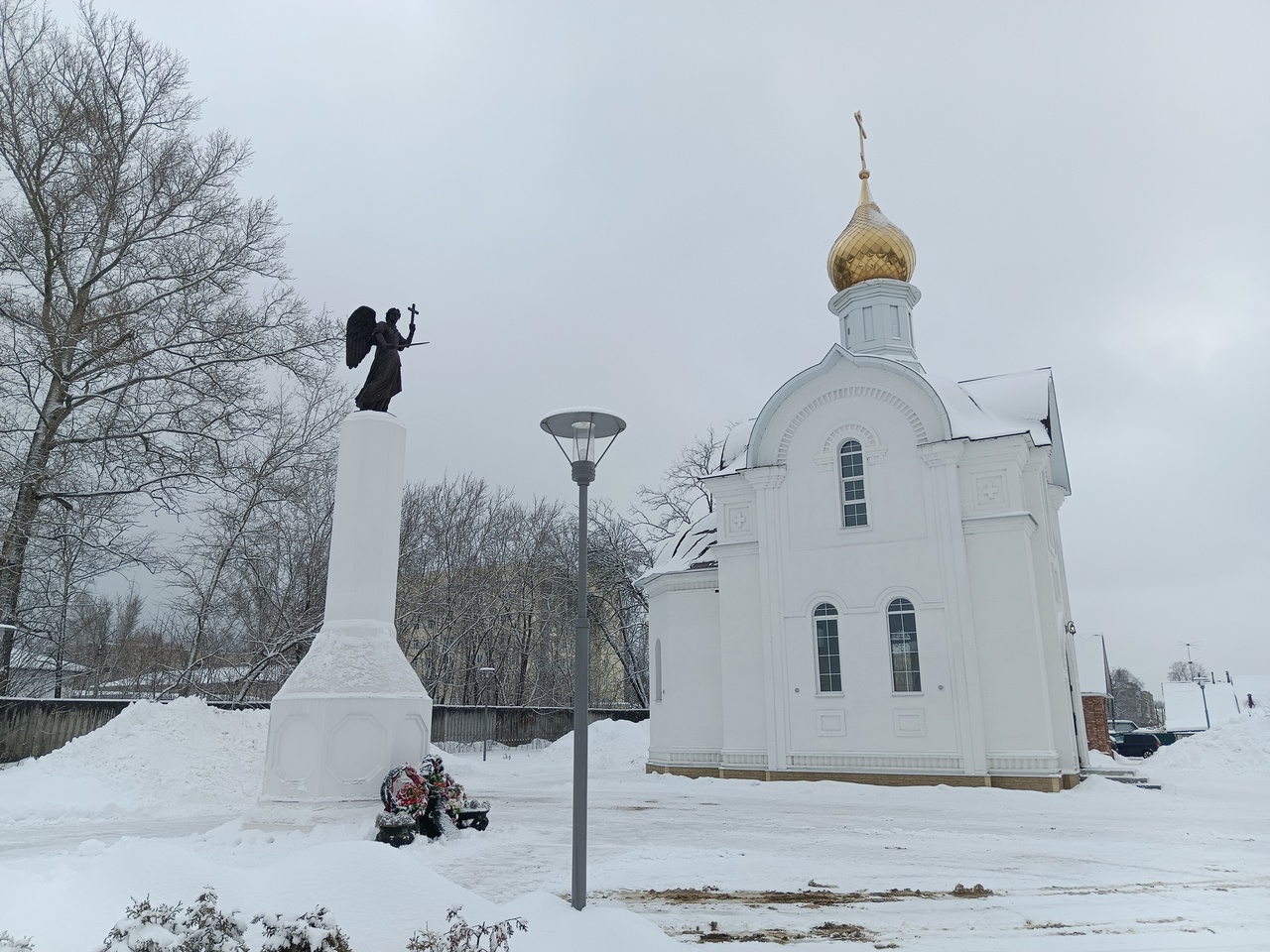 Образ святого покровителя воинов, защитника всех православных христиан от видимых и невидимых врагов венчает теперь обелиск у храма.