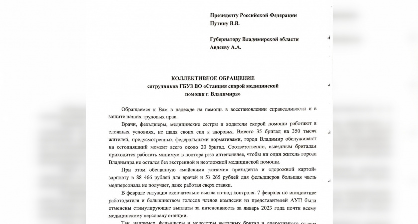 «Врачи, фельдшеры, медицинские сестры и водители скорой помощи работают в сложных условиях, не щадя своих сил и здоровья. Вместо 35 бригад на 350 тыс. жителей, предусмотренных нормативами, город Владимир обслуживают на сегодняшний момент всего около 20 бригад. При этом обещанную «майскими указами» президента и «дорожной картой зарплату в 88 466 рублей для врачей и 52 265 рубля для фельдшеров большая часть медперсонала не получает, даже работая сверх ставки,» – следует из обращения.