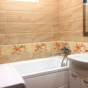 — в ванной дорогая красивая керамическая плитка,новая ванна, раковина, туалет и стиральная машинка;